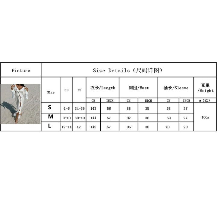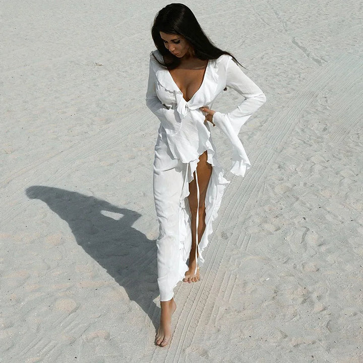 Stay breezy and elegant with this lightweight chiffon beach cover-up. Featuring a deep V-neck, ruffled details, and flowy long sleeves, it’s the perfect addition to your summer wardrobe for a stylish and comfortable beachside look.