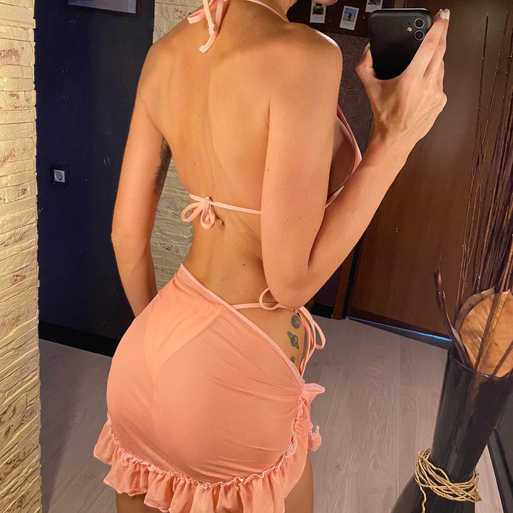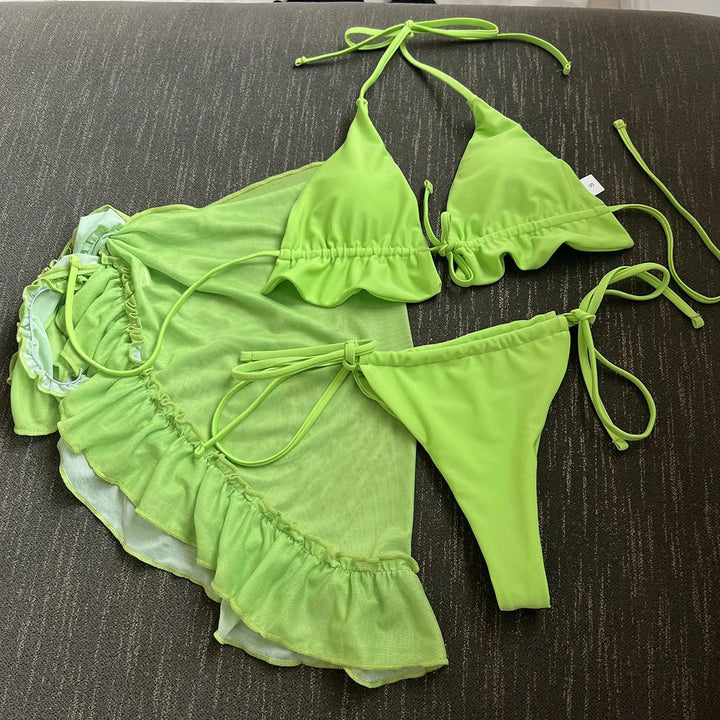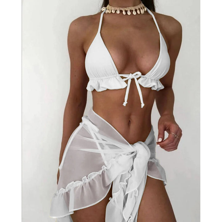 3-Piece Ruffled Bikini Set with Sarong β Halter Swimsuit for Women