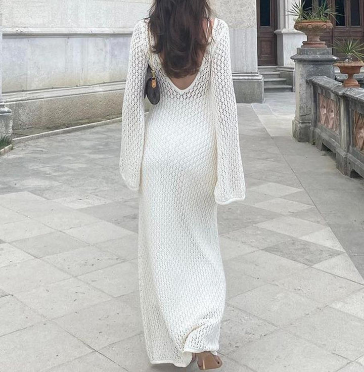 Turn heads on the beach with this sexy long knit cover-up dress. Featuring a deep V-neck, hollow-out design, and backless cut, it’s the perfect blend of elegance and allure for your holiday wardrobe.